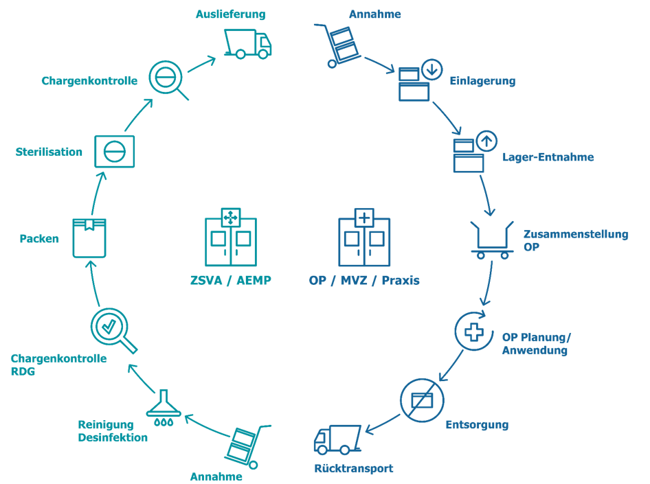 SPMintegra ermöglicht die abteilungsübergreifende Dokumentation und Optimierung aller Aufbereitungsschritte – mit Anbindung an OP, Lager und weitere Systeme.
